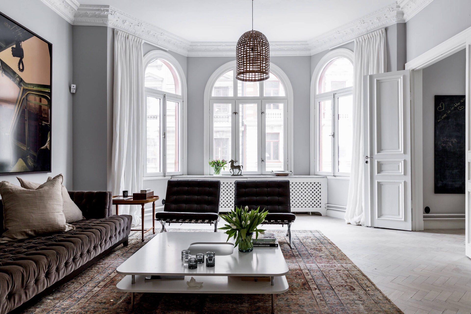 Τα μεγάλα με οβάλ τελειώματα παράθυρα, τα γύψινα διακοσμητικά στις οροφές, οι λευκές ξύλινες πόρτες, το συγκλονιστικό πέτρινο τζάκι στο χώρο του σαλονιού εκπέμπουν την αίγλη του παρελθόντος. Και ναι, η σχεδιαστική ομάδα εκτίμησε την δυναμικότητα του χώρου και κρατώντας αυτόν τον μοναδικό καμβά κατέληξε σε ένα εκπληκτικό αποτέλεσμα. Ένα πετυχημένο συνδυασμό της μοντέρνας, σοφιστικέ διακόσμησης, με την ευρυχωρία, αλλά και τη λειτουργικότητα σε πρώτο πλάνο. Αποδεικτικά στοιχεία το ανοιχτό γκρι χρώμα που κυριαρχεί σε κάθε δωμάτιο, τα σύγχρονα έργα τέχνης που έχουν τοποθετηθεί στρατηγικά μέσα στο σπίτι, η αξεπέραστη άνεση και οι κομψοί χώροι.