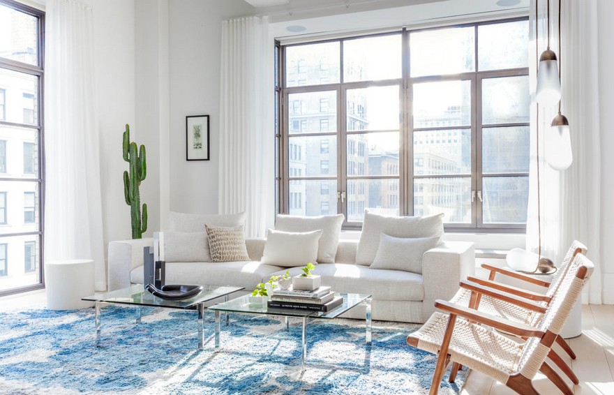 Τα μεγάλα και περίτεχνα χειροποίητα φωτιστικά προσθέτουν μια έντονη νότα, ενώ φέρνουν σε ισορροπία τα ψηλά ταβάνια του διαμερίσματος. Επίσης τα υπερμεγέθη έργα τέχνης και τα τολμηρά υφάσματα, όπως τα χαλιά προσθέτουν τις απαραίτητες χρωματικές πινελιές.