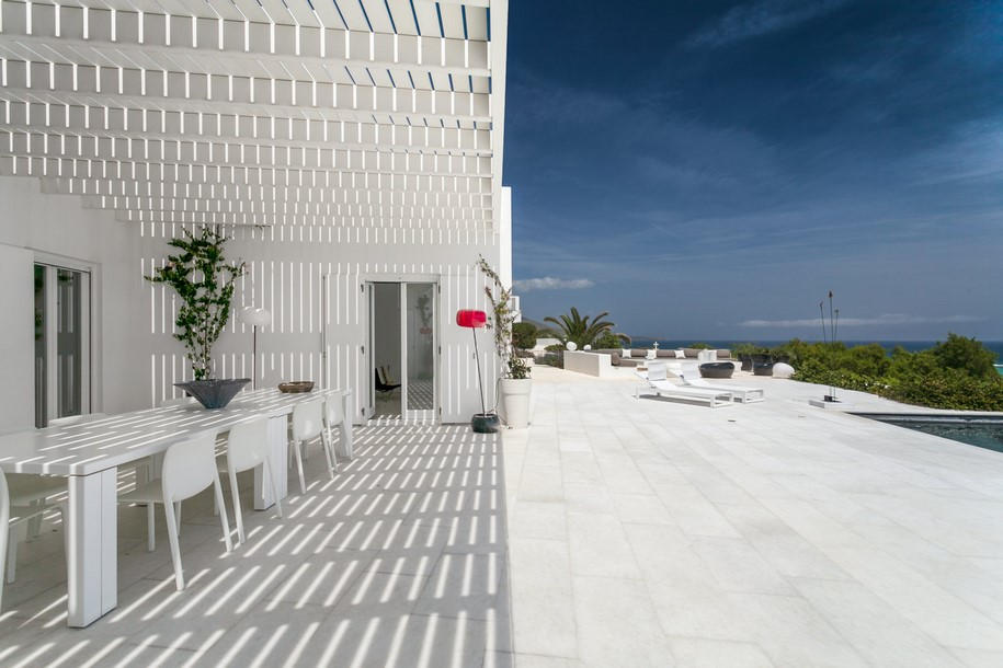 Σε όλους τους χώρους της κατοικίας εκτίθενται έργα τέχνης, σχέδια και αντικείμενα φημισμένων καλλιτεχνών γεγονός που ενισχύει το καλλιτεχνικό πνεύμα των ιδιοκτητών. Τα παράθυρα του σαλονιού ανοίγουν σε μια υπαίθρια τραπεζαρία που σκιάζεται από πέργκολα και στην εκτεταμένη μαρμάρινη βεράντα που αγκαλιάζει την πισίνα. Δίπλα στην πισίνα ένας μεγάλος χτιστός καναπές με θέα τη θάλασσα, χρησιμεύει ως σημείο χαλάρωσης κατά το ηλιοβασίλεμα… ενώ ιδιαίτερο σημείο αποτελεί το ελληνικό θέατρο, που είναι κτισμένο ανάμεσα στα δύο κτίρια, όπου υποδέχεται συχνά ηθοποιούς, μουσικούς και χορευτές.