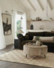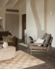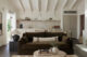 Το χαμηλό τραπεζάκι από μασίφ ξύλο, με οργανική φόρμα, ενισχύει την αίσθηση του χειροποίητου, ενώ τα διακοσμητικά αντικείμενα παραμένουν λιγοστά και ουσιαστικά. Κεραμικά, βιβλία, μικρά φυτά, όλα επιλεγμένα με σκοπό να αφηγηθούν μια ιστορία καθημερινότητας.