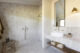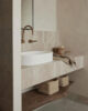 Το μπάνιο ακολουθεί την ίδια φιλοσοφία. Πέτρινες υφές, απλές γραμμές και φυσικά υλικά δημιουργούν μια εμπειρία που θυμίζει boutique retreat. Ο νιπτήρας με καθαρές φόρμες, οι αποθηκευτικοί χώροι από ξύλο και τα καλάθια από φυσικές ίνες συνθέτουν έναν χώρο που δεν περιορίζεται στη λειτουργικότητα.