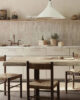 Η κουζίνα δεν ξεχωρίζει ως ένας καθαρά λειτουργικός χώρος, αλλά ενσωματώνεται πλήρως στην αισθητική του σπιτιού. Οι επιφάνειες με μικρά κεραμικά πλακίδια σε κάθετη τοποθέτηση δημιουργούν υφή, ενώ τα ντουλάπια σε απαλό τόνο διατηρούν τη φωτεινότητα.