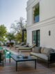 Οι βεράντες αναπτύσσονται σε επίπεδα, ακολουθώντας το ανάγλυφο και το κλίμα της περιοχής. Το outdoor living δίπλα στην πισίνα, αλλά και η πιο ιδιωτική ταράτσα στον τρίτο όροφο, λειτουργούν ως φυσική προέκταση του σπιτιού. Η infinity πισίνα, με το έντονο τιρκουάζ της, θυμίζει λιμνοθάλασσα και περιβάλλεται από έπιπλα που συνομιλούν χρωματικά με το τοπίο.