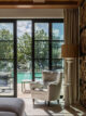 Μια απαλή εσοχή φιλοξενεί την ανοιχτή βιβλιοθήκη, λειτουργώντας ταυτόχρονα ως αρχιτεκτονικό και πρακτικό στοιχείο. Ένας μεγάλος πίνακας, δημιουργία φίλου της οικογένειας, συνομιλεί χρωματικά με τον χώρο, ενώ η κάθετη αποθήκευση ξύλων προσθέτει μια αίσθηση αυθεντικότητας και γείωσης. Από εδώ, η μετάβαση προς τη βεράντα και την πισίνα γίνεται σχεδόν ανεπαίσθητα.